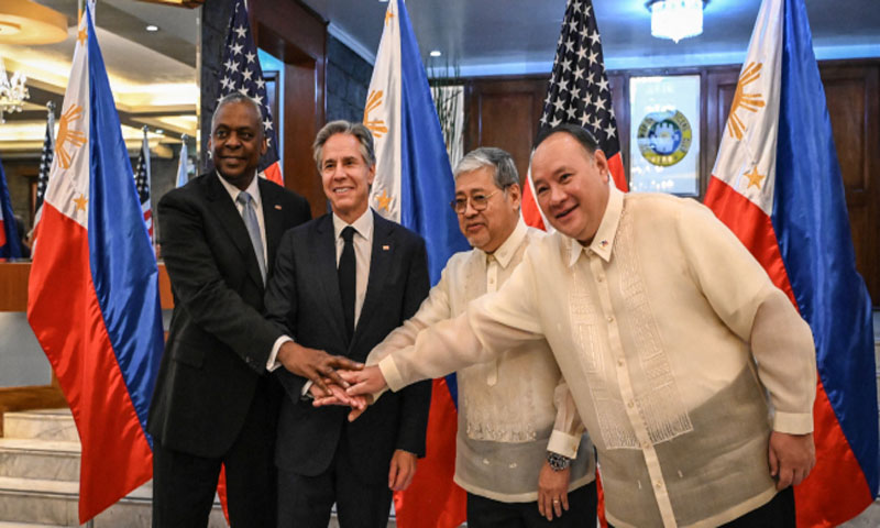 جولائی کے آخر میں، فلپائن اور امریکہ نے وزرائے خارجہ اور دفاع کے درمیان "2+2” مذاکرات کا ایک نیا دور منعقد کیا اور ایک مشترکہ بیان جاری کیا۔ بیان میں، امریکہ نے دعویٰ کیا کہ امریکہ اور فلپائن کے درمیان باہمی دفاعی معاہدہ جنوبی بحیرہ چین کے علاقے پر بھی لاگو ہوتا ہے، اور جاپان اور آسٹریلیا کے ساتھ مزید دفاعی اور سیکیورٹی تعاون کی اپیل کی۔ مذاکرات کے بعد، امریکی وزیر خارجہ انٹونی بلنکن نے اعلان کیا کہ امریکہ فلپائن کی دفاعی صلاحیتوں کو مضبوط بنانے کے لیے 500 ملین ڈالر کی فنڈنگ فراہم کرے گا۔