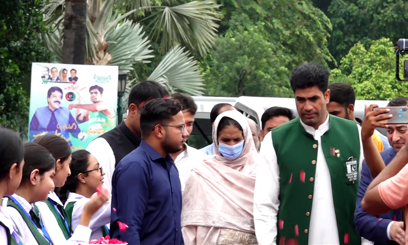 تفصیلات کے مطابق گولڈ میڈلسٹ ارشد ندیم کا گورنر ہاؤس پنجاب میں سلیم حیدر خان نے استقبال کیا۔