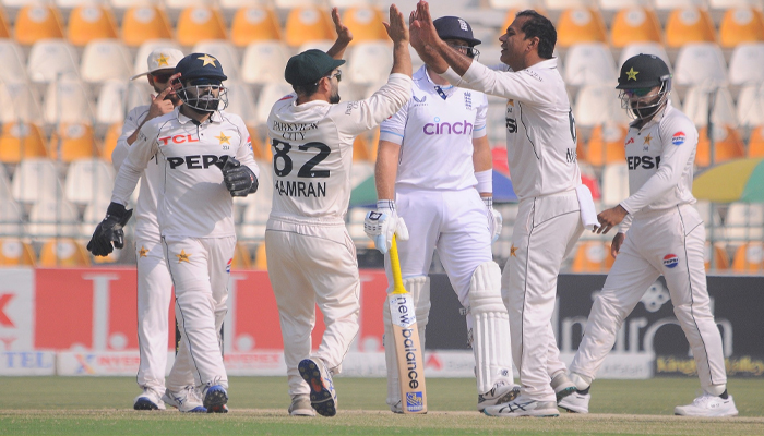 ملتان کرکٹ اسٹیڈیم میں کھیلے جارہے میچ کے چوتھے روز انگلینڈ نے 2 وکٹوں کے نقصان پر 36 رنز سے اننگز کا آغاز کیا تو محض ایک رن کے اضافے کے بعد اولی پوپ 22 کے انفراد اسکور پر آؤٹ ہوئے، بعدازاں جو روٹ 18 اور ہیری بروک 16، جیمی اسمتھ 6، بریڈن کارس 27، جیک لیچ ایک اور شعیب بشیر صفر رن پر پویلین لوٹے۔ کپتان بین اسٹوکس کی مزاحمتی اننگز 37 رنز تک محدود رہی۔