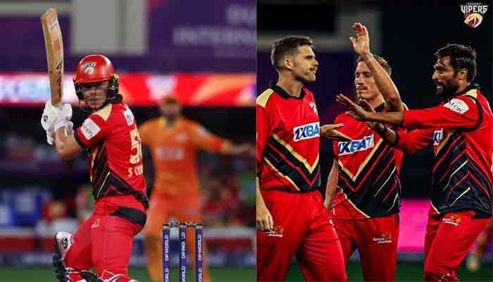 دبئی :دبئی انٹرنیشنل اسٹیڈیم میں کھیلے گئے میچ میں ڈیزرٹ وائپرز نے گلف جائنٹس کو 6 وکٹوں سے شکست دیکر مسلسل دوسری فتح اپنے نام کرلی۔ آل راؤنڈر سیم کرن کی 42 رنز کی ناقابل شکست اننگز نے ڈیزرٹ وائپرز کے لئے تعاقب کو آسان کردیا شیرفین ردرفورڈ نے 18 گیندوں پر 40 رنز بنا کر وائپرز کو 17.4 اوورز میں فتح دلائی۔وائپرز کے تیز گیند بازوں نے پہلی اننگز پر راج کیا کپتان لوکی فرگوسن اور محمد عامر نے بالترتیب 3 اور 3 وکٹیں حاصل کیں۔