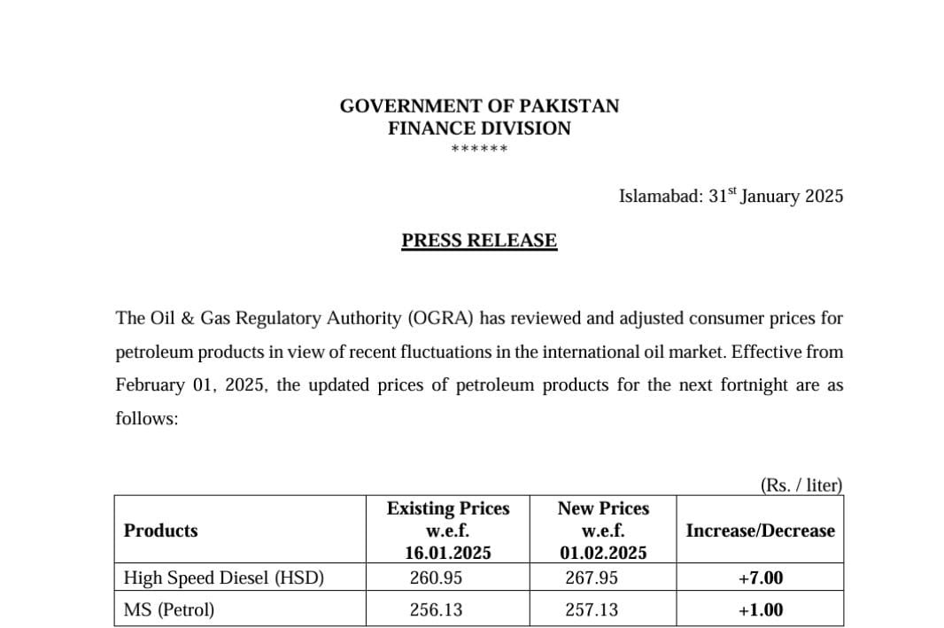وفاقی خزانہ ڈویژن سے جاری نوٹیفکیشن کے مطابق پٹرولیم مصنوعات کی قیمت میں مجموعی طور پر 7 روپے فی لیٹر تک اضافہ کردیا گیا ہے۔