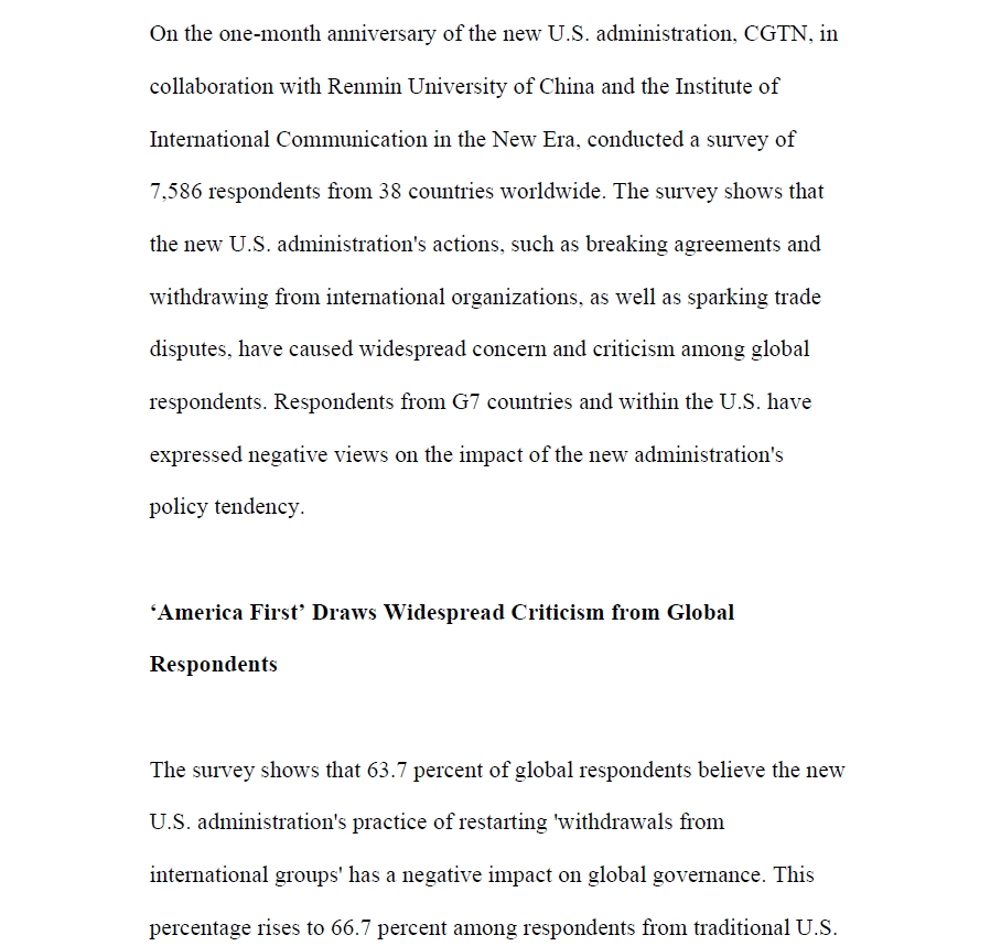 امریکی صدرکی صدارت میں ایک ماہ بہت مطمئن کہنا مشکل ، ٹرمپ کے دفتر میں پہلے مہینے واپسی کے لیے عالمی منظوری کی درجہ بندی کا انکشاف،چینی میڈیا سروے