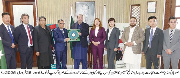صوبائی وزیر صنعت و تجارت چوہدری شافع حسین نے وفد سے گفتگو کرتے ہوئے کہا کہ پنجاب کے صنعتی مراکز میں صنعتی انفراسٹرکچر کی بہتری سے غیر ملکی سرمایہ کار پنجاب کو ترجیح دے رہے ہیں ۔چین کی متعدد کمپنیوں نے پنجاب میں اربوں ڈالر کی سرمایہ کاری کر رکھی ہے اورچین کی مزید کمپنیوں کی سرمایہ کاری کا خیر مقدم کریں گے ۔انہوں نے کہا کہ پنجاب میں چین کے سرمایہ کاروں اور ان کی سرمایہ کاری کو مکمل تحفظ حاصل ہے،صوبائی وزیر نے بتایا کہ گجرات میں نئی انڈسٹریل اسٹیٹ اور عالمی معیار کا فرنیچر کالج بنایا جا رہا ہے اور یہاں آرٹیفشل انٹیلیجنس کا کالج بھی بنے گا۔انہوں نے کہا کہ چین کی کمپنیوں کو پنجاب کے صنعتی مراکز میں صنعتی یونٹس لگانے کے لئے ضرورت کے مطابق اراضی دیں گے ۔چین کی سرمایہ کار کمپنیاں پنجاب میں کھلے دل سے سرمایہ کاری کریں ، حکومت ہر ممکن تعاون فراہم کرے گی ۔چوہدری شافع حسین نے کہا کہ چین کی سرمایہ کار کمپنیوں کے مقامی سرمایہ کاروں کے ساتھ جوائنٹ وینچر کا بھی وسیع سکوپ موجود ہے ،انہوں نے کہا کہ فیصل آباد میں ایکسپو سینٹر بھی بنایا جا رہا ہے چاہتے ہیں کہ الیکٹرک وہیکلز اور سولر پینلز کی مینوفیکچرنگ پنجاب میں ہو اور اس حوالے سے متعدد کمپنیوں سے بات چیت ہوئی ہے ۔