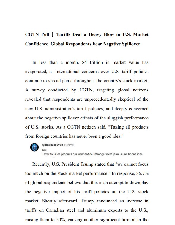 امریکی ٹیرف کی وجہ سے خود امریکی مارکیٹ میں اعتماد کی کمی ۔منفی اثرات کا خدشہ،سی جی ٹی این سروے بین الاقوامی By Rao Nama On مارچ 12, 2025 0 Share 0 Share FacebookTwitterGoogle+ReddItWhatsAppPinterestEmail