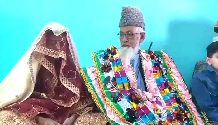 راجن پور:پنجاب کے ضلع راجن پور میں 80 سالہ بزرگ نے 48 سالہ خاتون سے شادی کرلی، تقریب کے دوران دولہے بزرگ گنگناتے رہے، جبکہ ان کے پوتے ڈھول کی تھاپ پر رقص کرتے رہے۔