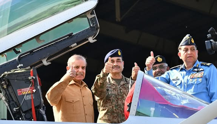 اعلامیے کے مطابق وزیراعظم شہباز شریف نے کامرہ ایئربیس کا دورہ کیا اور 21 ویں صدی کی سب سے طویل فضائی جھڑپوں میں سے ایک میں دشمن کی برتری کی خوش فہمی کو خاک میں ملانے والے پاک فضائیہ کے شاہینوں سے ملاقات کی۔