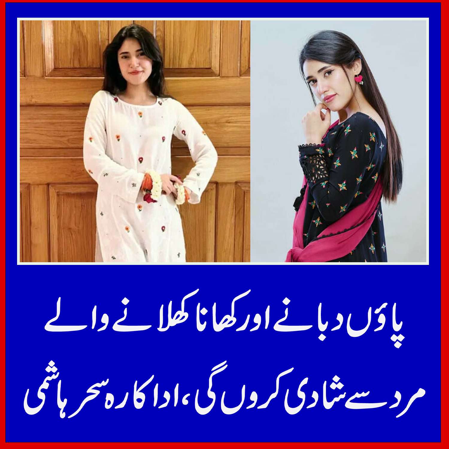 سحر ہاشمی نے مزید کہا کہ جو لڑکا انہیں اپنے ہاتھ سے کھانا کھلائے گا اور جو ان کے پاؤں دبائے گا، وہ اس سے شادی کریں گی۔