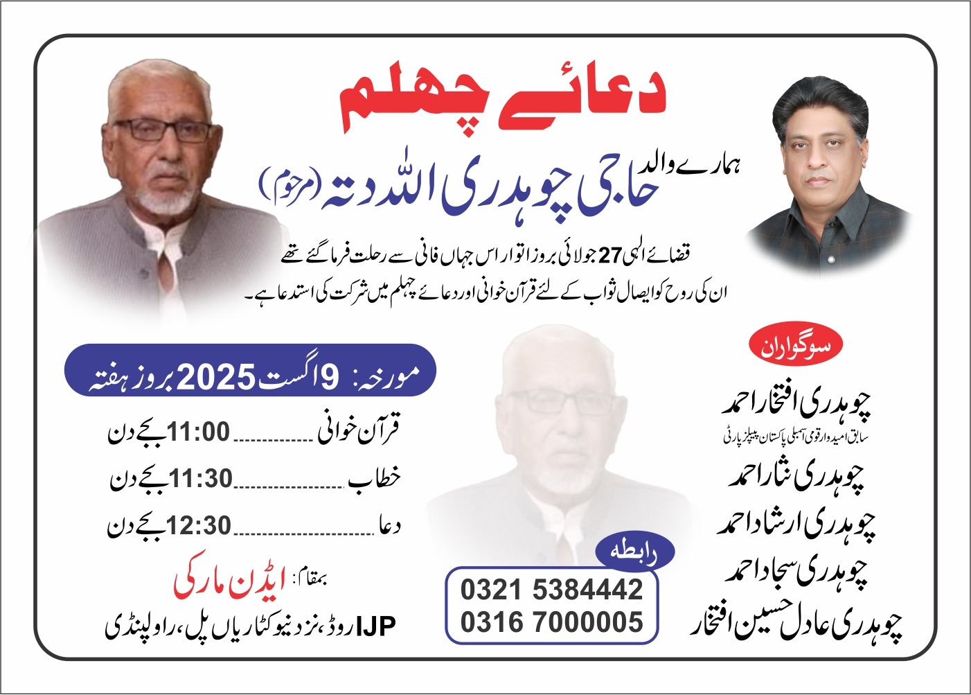 اس موقع پر معروف بزنس مین اور سماجی شخصیت سید طاہر ایاز گیلانی ھی ان کے ہمراہ تھے۔غلام مصطفیٰ ملک نے جاپان میں مقیم ممتاز ممتاز اوورسیز پاکستانی اوع اپنے بڑے بھی بھائی، ملک لیاقت علی کی جانب سے مرحوم کے صاحبزادگان چوہدری افتخار احمد، چوہدری ارشاد احمد اور چوہدری نثار احمد اور دیگر اہل خانہ سے تعزیت کا اظہار کیا اور مرحوم کی مغفرت کے لیے فاتحہ خوانی کی۔ انہوں نے کہا کہ چوہدری اللہ دتہ مرحوم ایک بااخلاق، خدمت گزار اور باوقار شخصیت تھے، جن کی کمی طویل عرصہ محسوس کی جاتی رہے گی۔