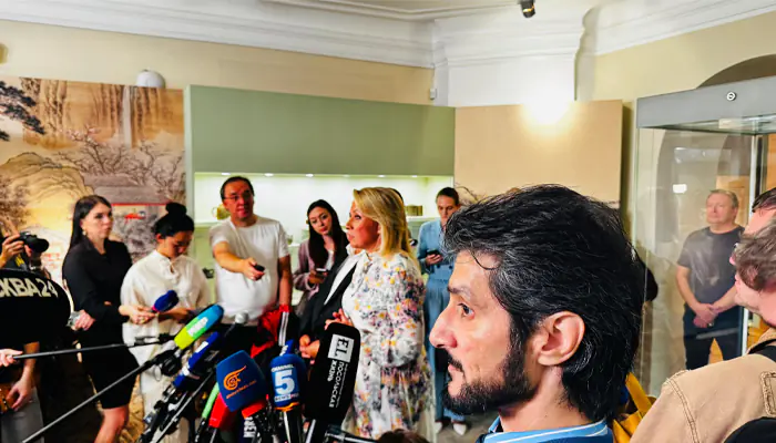 پاکستانی صحافی اور اور صدائے روس کے ایڈیٹر اشتیاق ہمدانی نے ماریہ زاخارووا سے سوال کیا کہ موجودہ عالمی کشیدگی کے ماحول میں وہ ثقافتی موضوعات کے لیے وقت کیسے نکال پاتی ہیں؟ اس پر زاخارووا نے جواب دیا کہ مشکل حالات میں تخلیقی عمل ہی انسان کو جینے کا حوصلہ دیتا ہے۔ انہوں نے ماضی کی مثالیں دیتے ہوئے کہا کہ دوسری جنگِ عظیم کے دوران بھی فن اور تخلیق نے لوگوں کو امید دی۔ انہوں نے وکٹر بوتا کا حوالہ دیتے ہوئے کہا کہ قید اور مشکلات کے باوجود اس نے اپنی تخلیقی صلاحیتوں کے ذریعے نئی زندگی پائی، جو اس بات کی علامت ہے کہ انسان اندر سے کتنا مضبوط ہو سکتا ہے۔