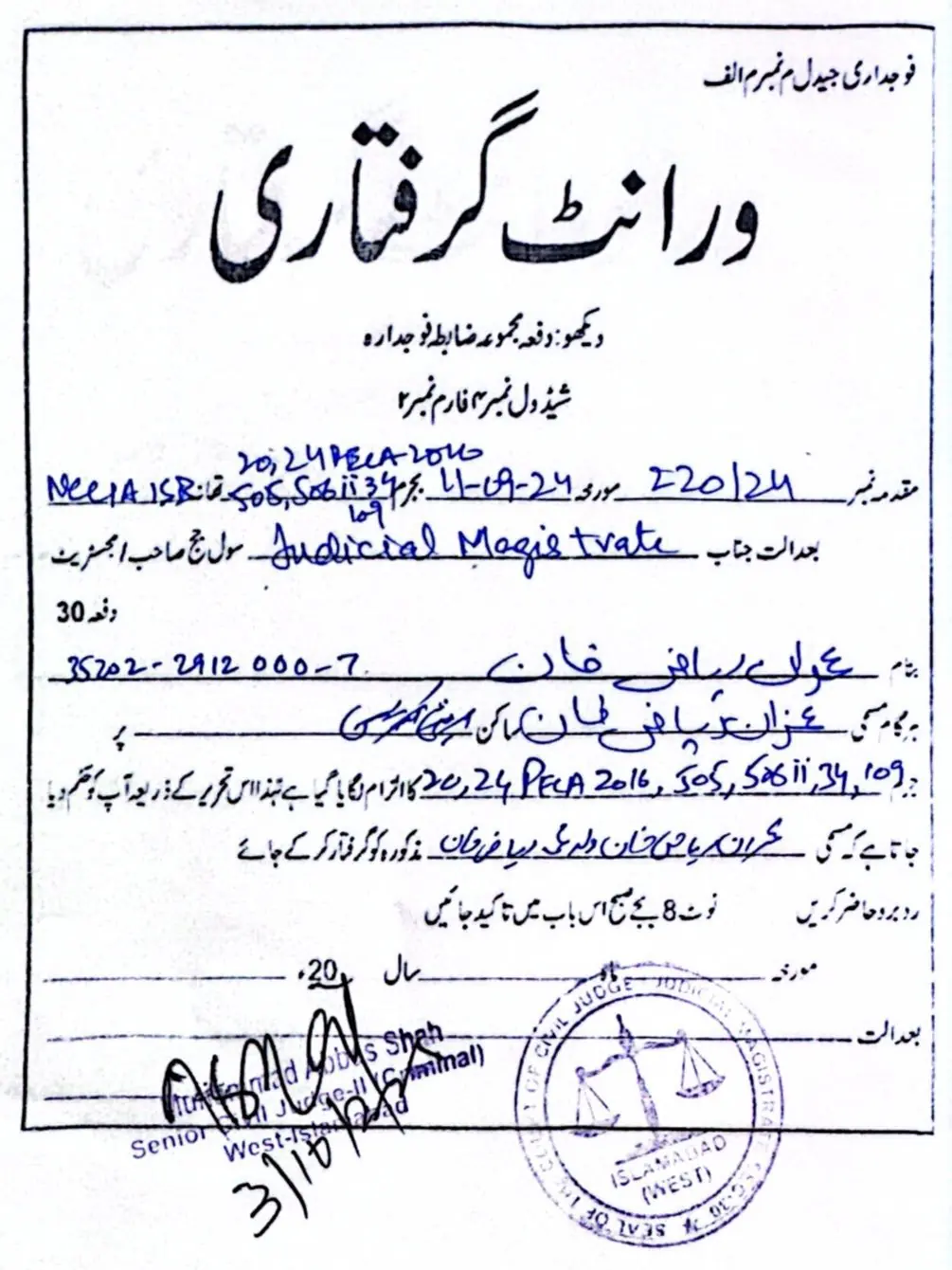 جوڈیشل مجسٹریٹ عباس شاہ نے این سی سی آئی اے کی جانب سے دائر درخواست پر وارنٹ گرفتاری جاری کیے۔ذرائع کے مطابق این سی سی آئی اے نے عدالت میں مؤقف اختیار کیا تھا کہ عمران ریاض خان کے خلاف جج ہمایوں دلاور سے متعلق مبینہ سوشل میڈیا مہم کے شواہد موجود ہیں، اس لیے ان کی گرفتاری ناگزیر ہے۔