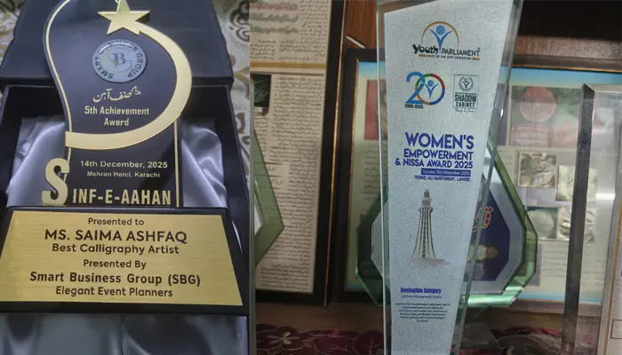 حال ہی میں لاہور میں منعقدہ فن عظیم قومی نمائش میں انہیں خصوصی میڈل اور اعزاز دیاگیا ہے۔کراچی میں صنف آہن کے زیر اہتمام منعقدہ پانچویں اچیومنٹ ایوارڈز تقریب میں سمارٹ بزنس گروپ کی طرف سے بہترین کیلیگرافی ارٹسٹ میڈل دیا گیا ہے۔لاہور کیہی علی آڈیٹوریم میں وویمنز امپاورمنٹ اینڈ نسا ایوارڈز 2025,کی تقریب میں لائف اچیومنٹ ایوارڈ د یا گیا ہے۔نیپال کے دارالحکومت کھٹمنڈو میں ساتھ ایشین بزنس پارٹنرشپ کے زیر اہتمام عظیم الشان تقریب میں انہیں ایشین ایکسیلینس اچیومنٹ 2025 سے نوازا گیا۔عدیم الفرصتی کی وجہ سے وہ بہ نفس نفیس اس تقریب میں شرکت نہ کر سکیں ۔ان کا ایوارڈ انہیں پاکستان ارسال کیا گیا۔اس میں ٹرافی’میڈل اور توصیفی سند شامل ہیایوارڈز دو ینے کی تقریب کھٹمنڈو کے معروف جیرامایانا اڈیٹوریم میں منعقد ہوئی ۔ساوتھ ایشین بزنس پارٹنرشپ کی طرف سے انہیں جدید فن خطاطی میں نمایاں اور گرانقدر خدمات پر مبارک باد دی گئی ہے