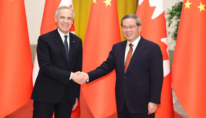 بیجنگ : چین کے وزیرِ اعظم لی چھیانگ نے بیجنگ کے عظیم عوامی ہال میں کینیڈا کے وزیرِ اعظم مارک کارنی کے ساتھ بات چیت کی، جو چین کے سرکاری دورے پر بیجنگ میں موجود ہیں۔جمعہ کے روز چینی میڈیا کے مطابقلی چھیانگ نے کہا کہ چین اور کینیڈا کے تعلقات کی صحت مند اور مستحکم ترقی دونوں ممالک کے مشترکہ مفادات کے عین مطابق ہے۔ چین کینیڈا کے ساتھ اسٹریٹجک شراکت داری کی حیثیت برقرار رکھنے، سیاسی باہمی اعتماد کو بڑھانے، ایک دوسرے کے مرکزی مفادات کا احترام کرنے، اختلافات کو پسِ پشت ڈال کر مشترکہ مفادات تلاش کرنے اور عملی تعاون کو مسلسل وسعت دینے کا خواہاں ہے۔ لی چھیانگ نے نشاندہی کی کہ دونوں ممالک کے درمیان تعاون کی وسیع گنجائش موجود ہے، اور وہ مزید کینیڈین کمپنیوں کو چین میں سرمایہ کاری کے لیے خوش آمدید کہتے ہیں۔ چین کینیڈا کے ساتھ مل کر کثیر جہتی اور آزاد تجارت کے تحفظ اور گلوبل گورننس کی بہتری کے لیے کام کرنے کے لیے تیار ہے۔وزیرِ اعظم کارنی نے کہا کہ کینیڈا عوامی جمہوریہ چین کو تسلیم کرنے والے اولین مغربی ممالک میں سے ایک ہے اور سفارتی تعلقات کے قیام کے بعد سے کینیڈا کی حکومت نے ہمیشہ ایک چین کی پالیسی کی سختی سے پاسداری کی ہے۔ کینیڈا باہمی احترام کی بنیاد پر چین کے ساتھ تجارت، توانائی، گرین اکانومی، زراعت اور عوامی سطح کے روابط جیسے شعبوں میں تعاون کو فروغ دینے کا خواہشمند ہے۔ کینیڈا چین کے ساتھ رابطے اور ہم آہنگی کو مضبوط کرنے کے لیے تیار ہے اور چینی کمپنیوں کو کینیڈا میں سرمایہ کاری اور کاروبار شروع کرنے کے لیے خوش آمدید کہتا ہے۔ انہوں نے "جامع اور ترقی پسند ٹرانس پیسیفک پارٹنرشپ معاہدے” (CPTPP) میں شمولیت کے لیے چین کی درخواست کو بھی سراہا۔بات چیت کے بعد، دونوں وزرائے اعظم نے مشترکہ طور پر تجارت، کسٹمز، توانائی، تعمیرات، ثقافت اور عوامی تحفظ سمیت متعدد شعبوں میں تعاون کی دستاویزات پر دستخط کی تقریب کا مشاہدہ کیا۔اسی دن،چین کی قومی عوامی کانگریس کی قائمہ کمیٹی کے چیئرمین چاؤ لہ جی نے بھی بیجنگ میں کینیڈین وزیرِ اعظم کارنی سے ملاقات کی۔