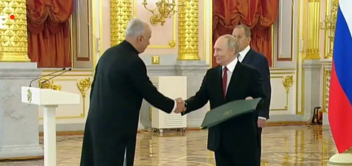ماسکو (اشتیاق ہمدانی)روسی دارالحکومت ماسکو میں اسلامی جمہوریہ پاکستان کے سفیرِ کبیر فیصل نیاز ترمذی نے روسی صدر ولادیمیر ولادیمیرووچ پوتن کو اپنی اسنادِ سفارت پیش کر دیں۔