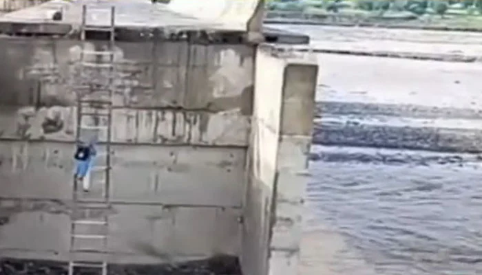 سیلاب سے رابطہ پل کا راستہ ٹوٹنے کے باعث شہری سیڑھی کے ذریعے دریا پار کرنے پر مجبور