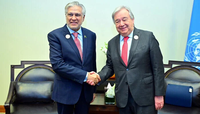 اقوام متحدہ کے سیکریٹری جنرل نے اسحاق ڈار سے ٹیلی فون کے ذریعے رابطہ کیا اور خطے میں امن کے فروغ کے لیے پاکستان کی کوششوں کو سراہا۔