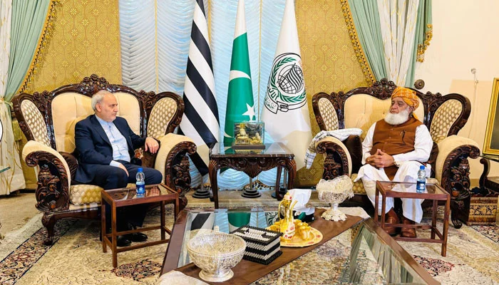 ایرانی سفیر رضا امیری مقدم کی قیادت میں وفد اسلام آباد میں مولانا فضل الرحمان کی رہائش پر پہنچا اور جے یو آئی سربراہ سے ملاقات کی۔
