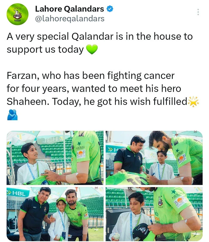 پی ایس ایل چیمپئن لاہور قلندرز نے کینسر میں مبتلا بچے کی کپتان شاہین آفریدی سے ملنے کی خواہش پوری کر دی۔