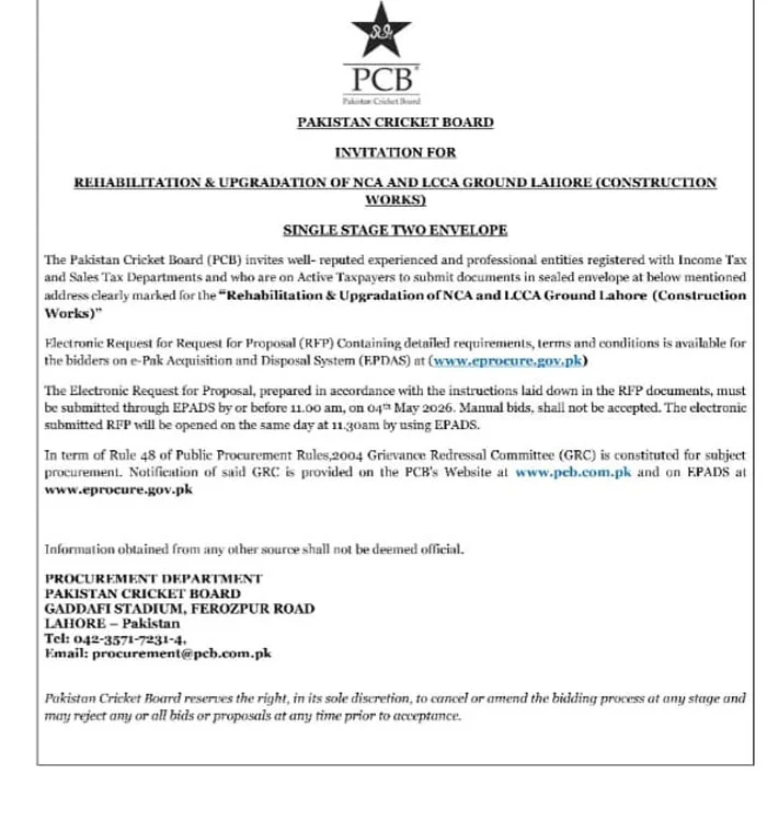 پی سی بی نے ان اپ گریڈیشن اور بحالی (ری ہیب) منصوبوں کے لیے مختلف کمپنیوں سے پیشکشیں طلب کر لی ہیں، دلچسپی رکھنے والی پارٹیز 4 مئی تک اپنے پروپوزلز جمع کرا سکتی ہیں۔