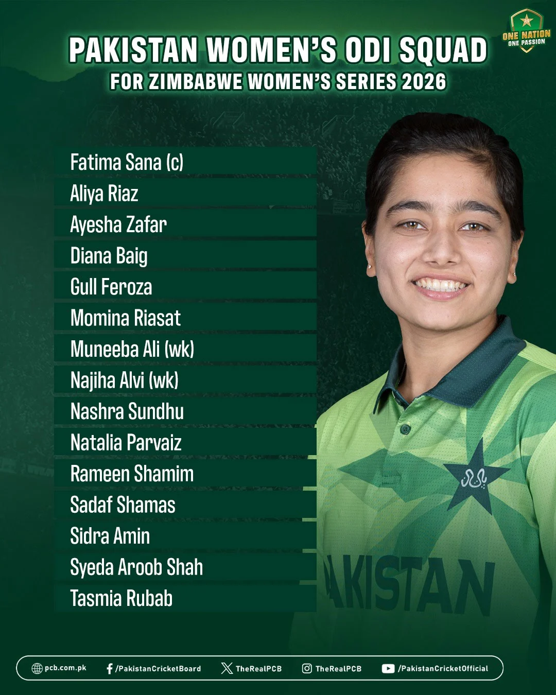 زمبابوے کے خلاف ون ڈے سیریز کے لیے پاکستان ویمن ٹیم کا اعلان کر دیا گیا، قومی ویمن ٹیم کی قیادت فاطمہ ثناء کریں گی۔