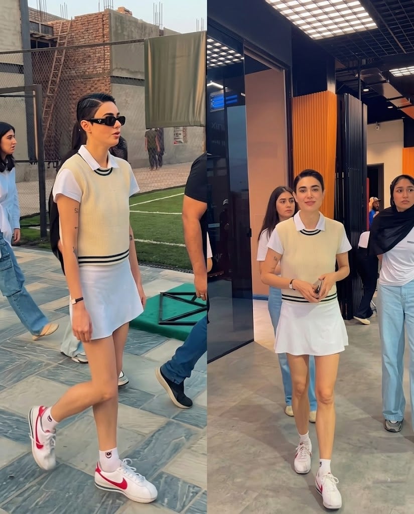 انہوں نے شارٹ پکسی ہیئر کٹ کے ساتھ ایک منفرد لباس زیب تن کیا جس میں سفید منی اسکرٹ، سادہ شرٹ اور بغیر آستینوں کا ٹینس سوئیٹر شامل تھا۔